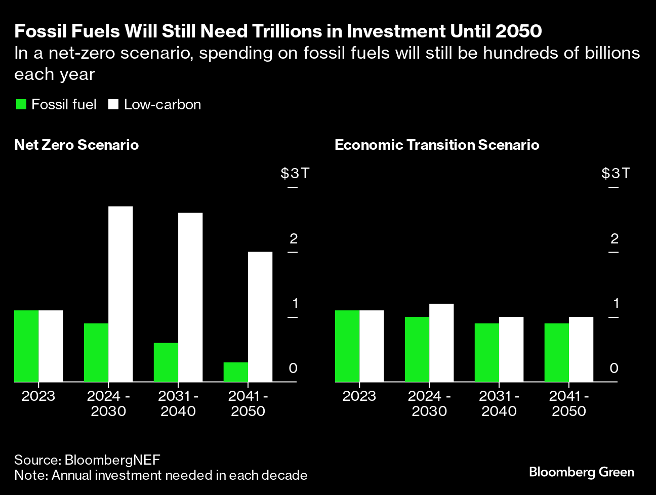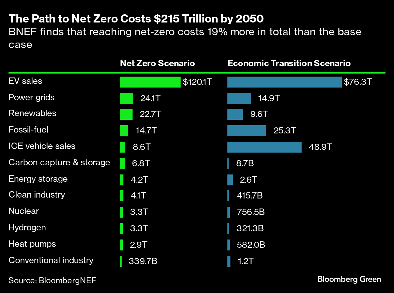 BNEF’s figures are based on the upfront capital needed to build green infrastructure and don’t include operating expenses. This means any scenario that consumes more fossil fuels than needed for being on track to net zero could ultimately be more expensive to implement — though BNEF has not yet run those calculations.