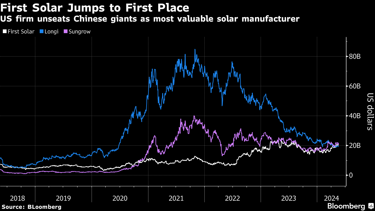 Of course, market capitalization is just one way to measure companies. By most other metrics, including the vital one of being able to produce enough clean energy to fight climate change, First Solar still has a way to go to catch up with its Chinese counterparts. It produced 12 gigawatts of panels in 2023, compared to 79 gigawatts for Shanghai-based Jinko Solar Co.