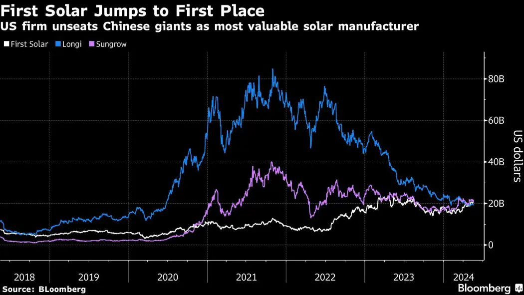 (Bloomberg) -- A US company has become the world’s most valuable solar manufacturer for the first time since 2018, as Chinese rivals suffer from a profit-slashing price war and an onslaught of trade barriers erected by Washington.