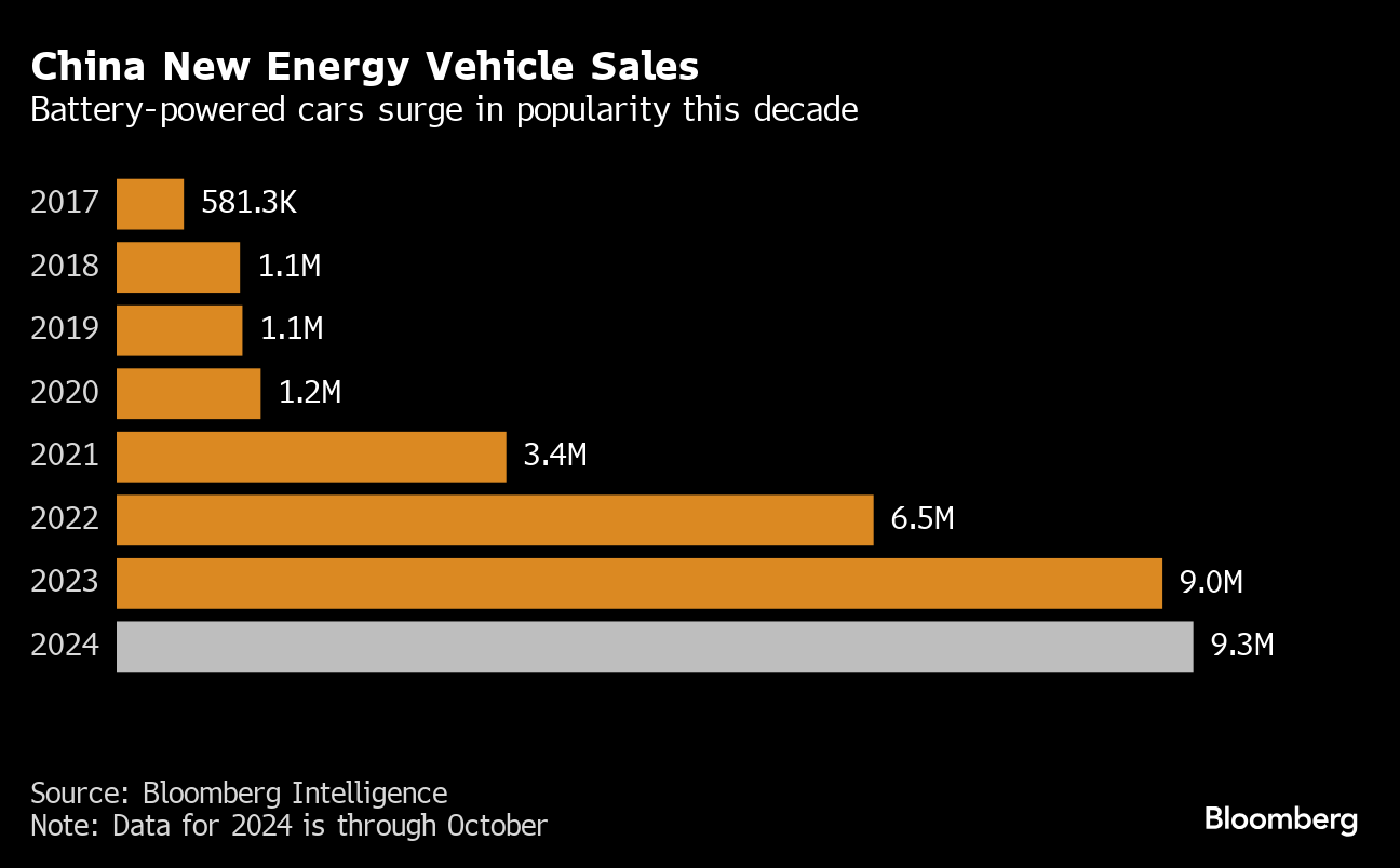 China’s path toward electrification is faster than in other economies. In the US, EV’s still represent only about 10% of total car sales, and BloombergNEF sharply scaled back its forecasts for growth after the Republican election sweep.