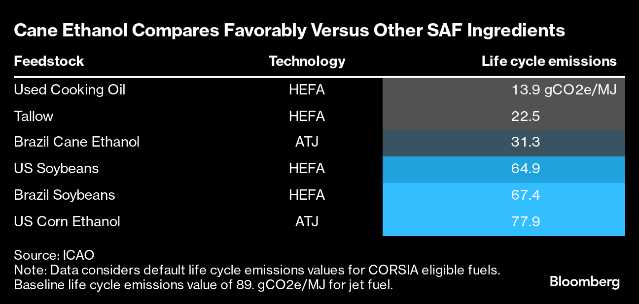 According to data by the International Civil Aviation Organization, Brazilian sugar cane ethanol has lower carbon emissions compared to other SAF ingredients such as soybean oil or US corn-based ethanol. That means Brazilian-produced SAF would likely be more efficient in helping airlines reach targets to reduce their carbon emissions.