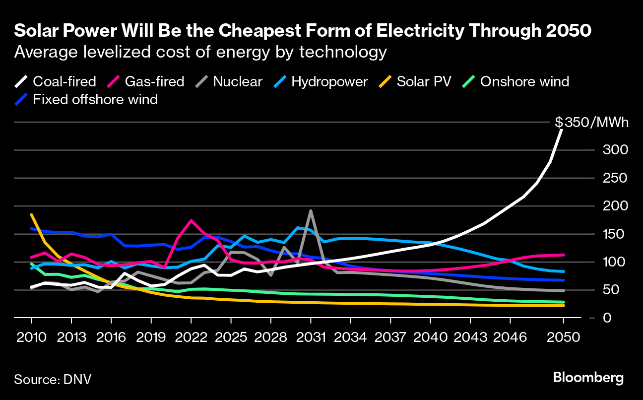 (Bloomberg) -- The world is choking from emissions more than ever but that trend is set to reverse starting next year as the cost of solar panels and batteries crowd out coal and stunt the growth of oil, a new report says.