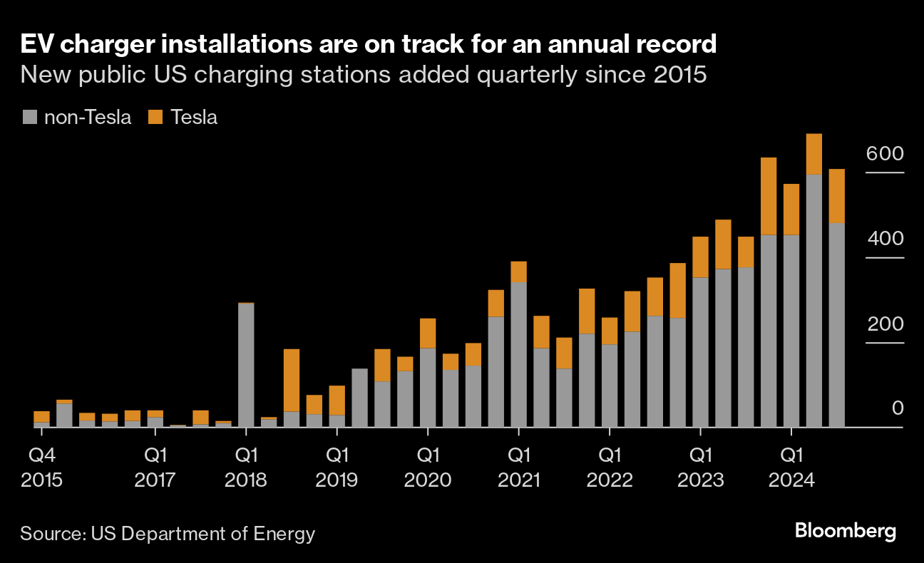 Roughly 600 quick-turn stations switched on in the third quarter across the US, a 7% increase from the end of June, according to a analysis of Department of Energy data. There are now nearly 9,000 public, fast-charging sites in the US, and their proliferation has only quickened.