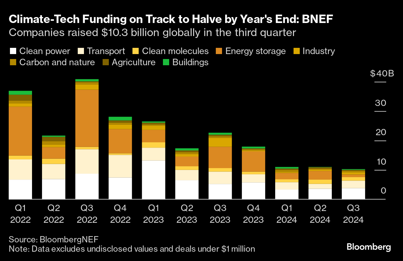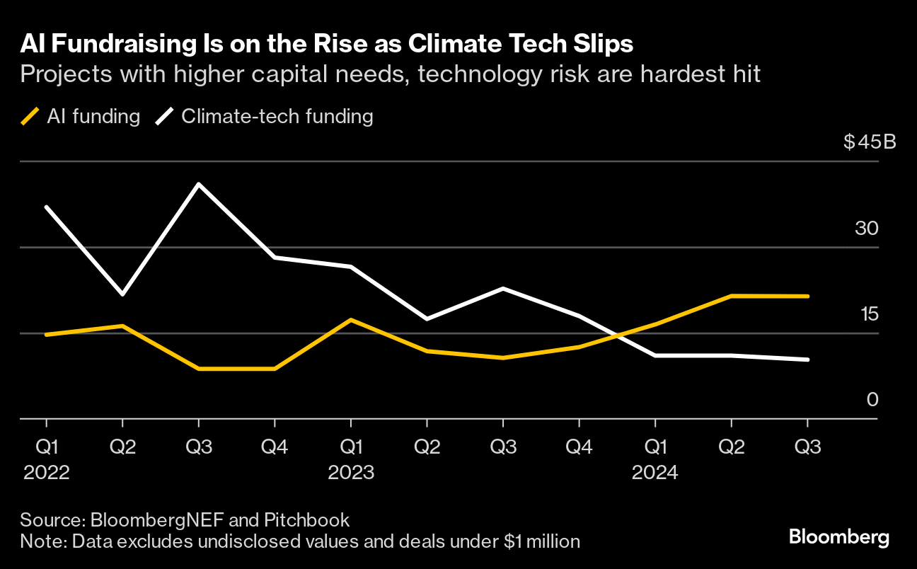 Globally, climate-tech companies raised roughly $10.3 billion in equity across public and private markets in the third quarter, putting full-year funding on track to fall about 50% this year, data from BloombergNEF show. Meanwhile, capital for AI has climbed, with startups in that space raising more than $21 billion in the quarter, Pitchbook estimates.