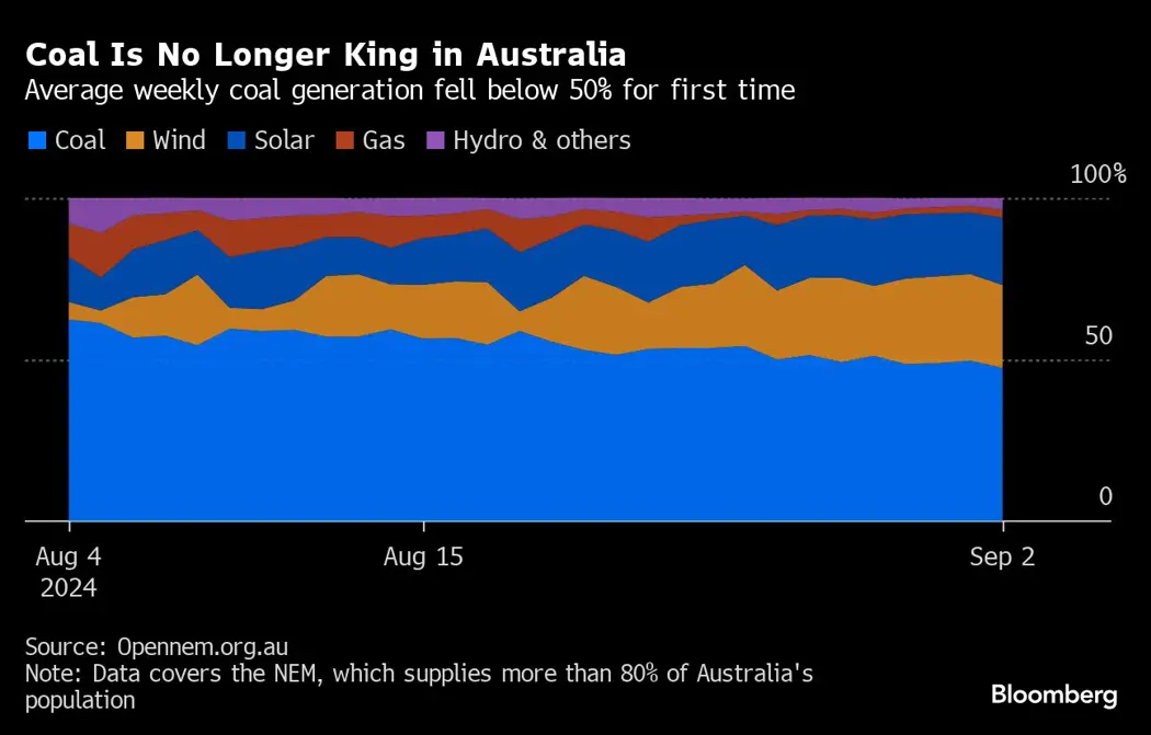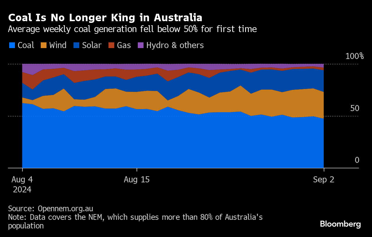 (Bloomberg) -- The high winds that have been lashing southeastern Australia over the past few days have pushed coal-fired power below 50% of the country’s power mix for the first time ever.