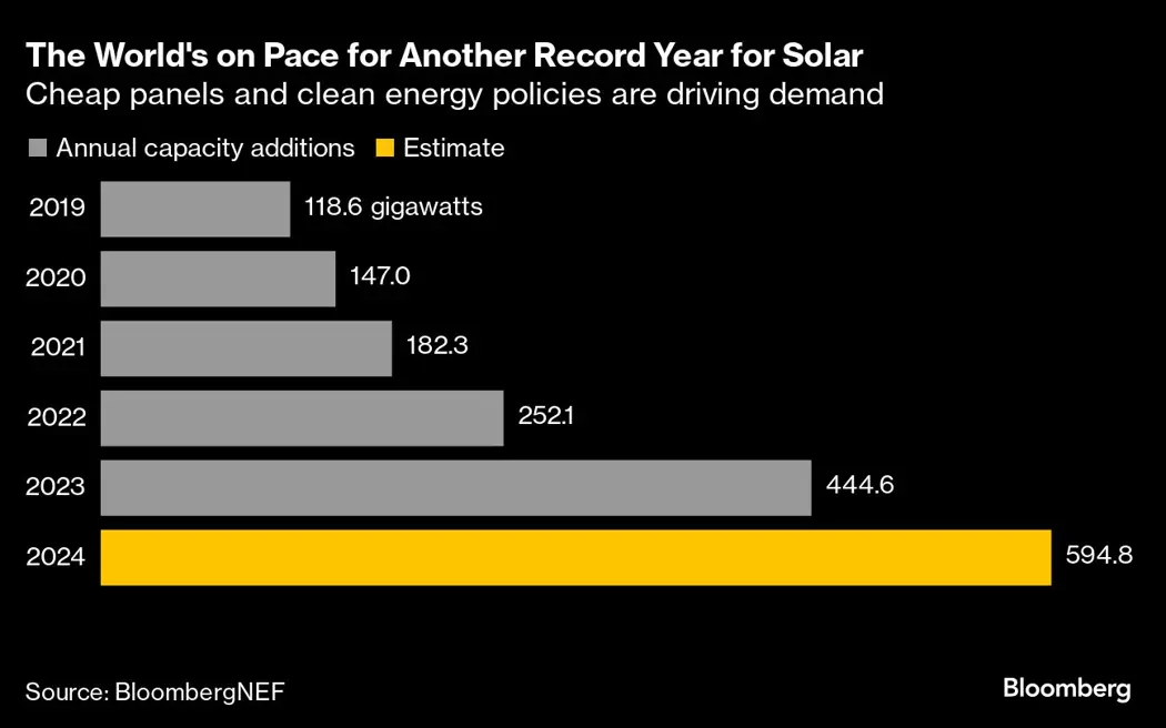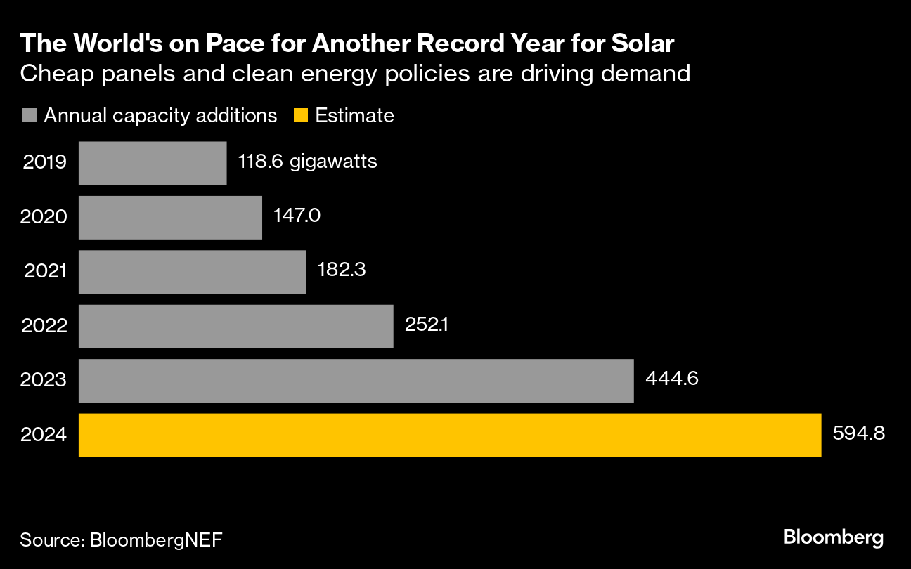 (Bloomberg) -- Solar capacity around the world will be installed at a record pace in 2024, as bargain panel prices help countries’ efforts to deploy cleaner energy.