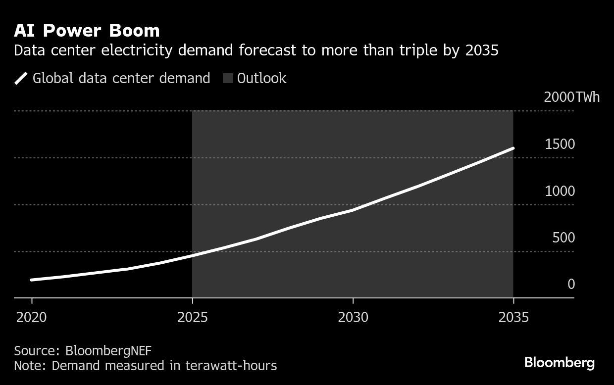 The rise of AI is also reshaping US power markets, with data center demand projected to rise from 3.5% of total electricity demand today to 8.6% by 2035, according to another BNEF report released Tuesday. Amazon.com Inc. is the biggest data center operator with close to three gigawatts of capacity and another 12 gigawatts in its pipeline, followed by Microsoft Corp., Meta Platforms Inc. and Alphabet Inc.’s Google. US companies have developed the most major AI models, indicating that most large-scale AI training takes place in the US, the report said.