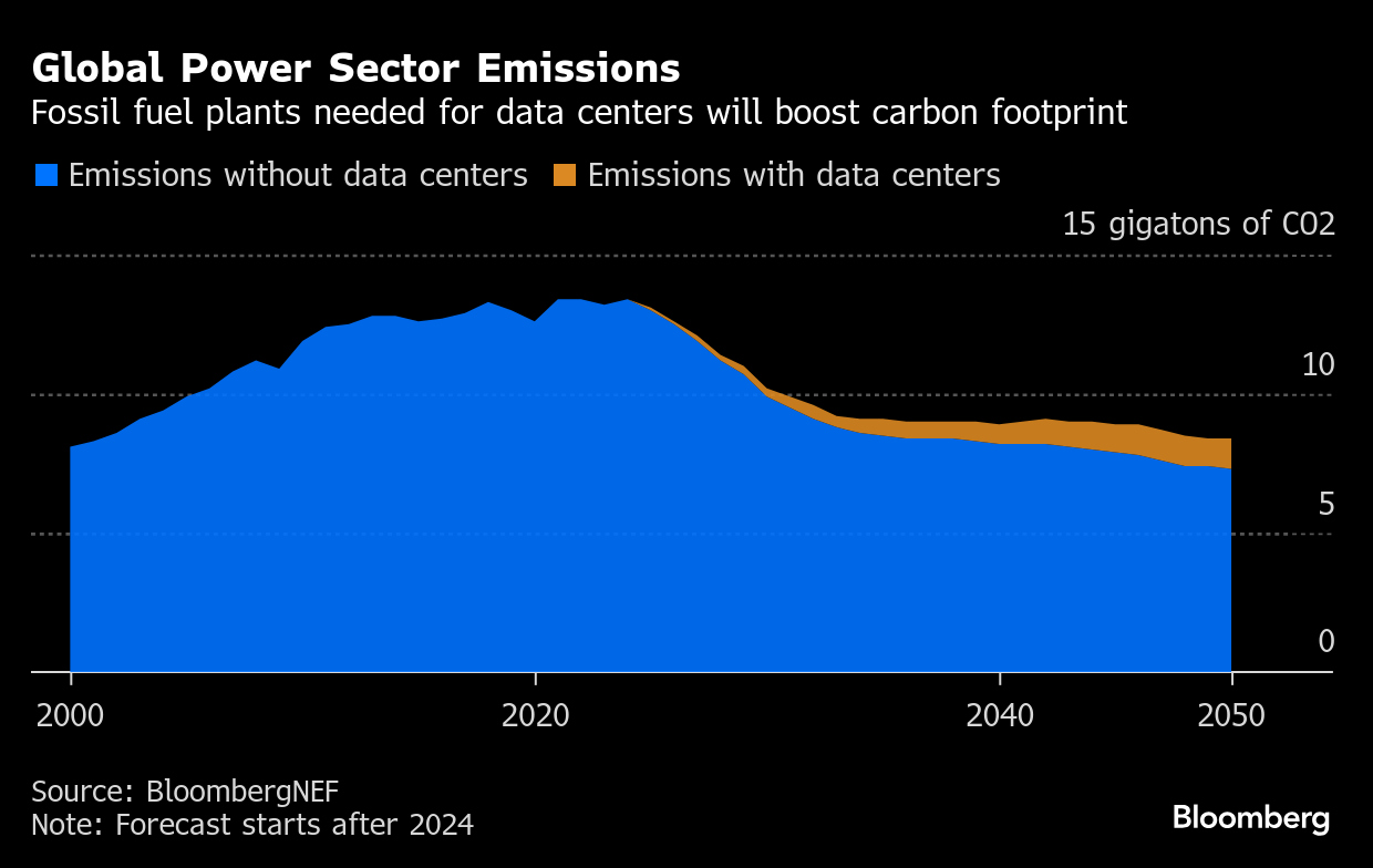 (Bloomberg) -- The world likely hit peak energy-related emissions in 2024. But the decline in the coming decade will be slowed due in large part to data center expansion powered by fossil fuels, according to the latest New Energy Outlook report from BloombergNEF.