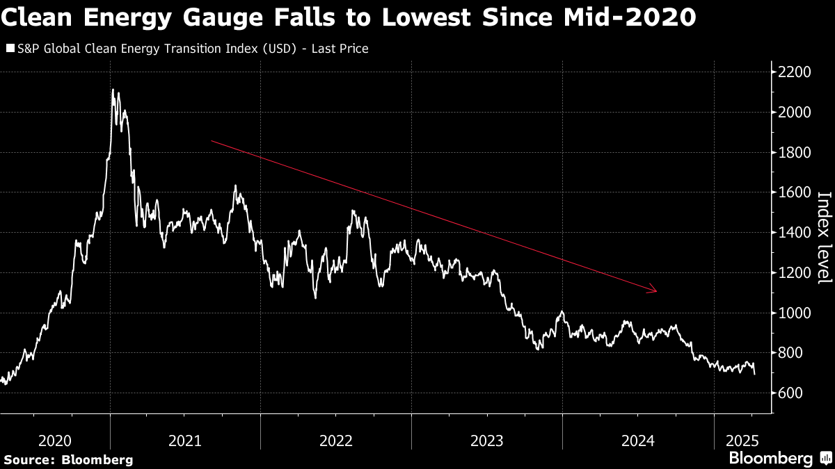 The S&P Global Clean Energy Transition Index has fallen more than two-thirds from a peak in early 2021. The sector has been bruised by a political backlash against climate investing and rising interest rates, which marked the end of cheap debt for wind and solar projects. Now, tariff increases are likely to have outsized impacts on China and Southeast Asian nations critical to clean energy supply chains, exacerbating worries about financing costs.