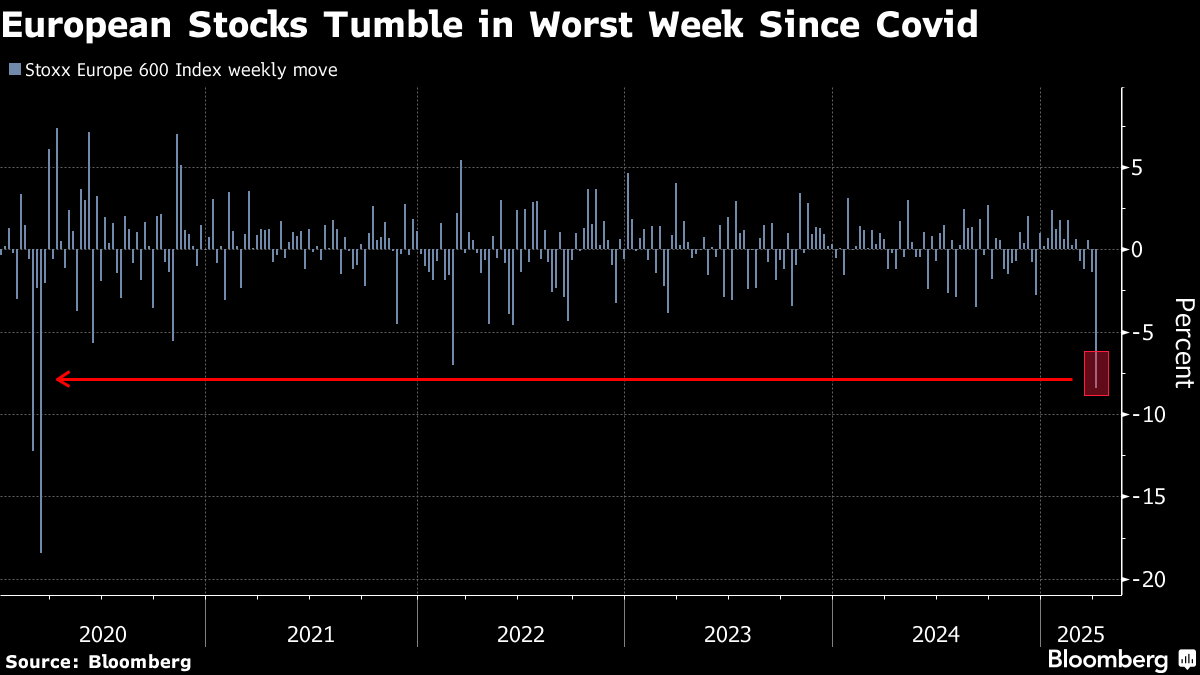 The Stoxx Europe 600 Index slid 5.1% at the close in London, recording its worst weekly drop since the outbreak of the Covid-19 pandemic five years ago. Indexes in Italy, France, Switzerland and Germany were also in correction territory after news that Beijing would impose a 34% tariff on all imports from the US, starting April 10.