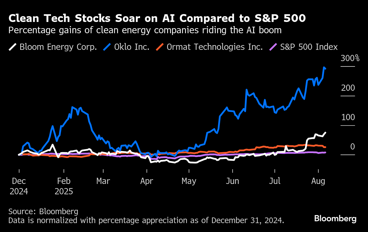 Clean technology companies that have inked deals to support data centers have seen their stocks soar this year, outperforming the S&P 500. Nuclear power startup Oklo Inc.’s shares are up nearly 275% year-to-date while the stock price of fuel cell provider Bloom Energy Corp. has risen 66%. Energy storage and clean power snagged the most public and private investment among climate tech sectors last quarter, according to BloombergNEF.