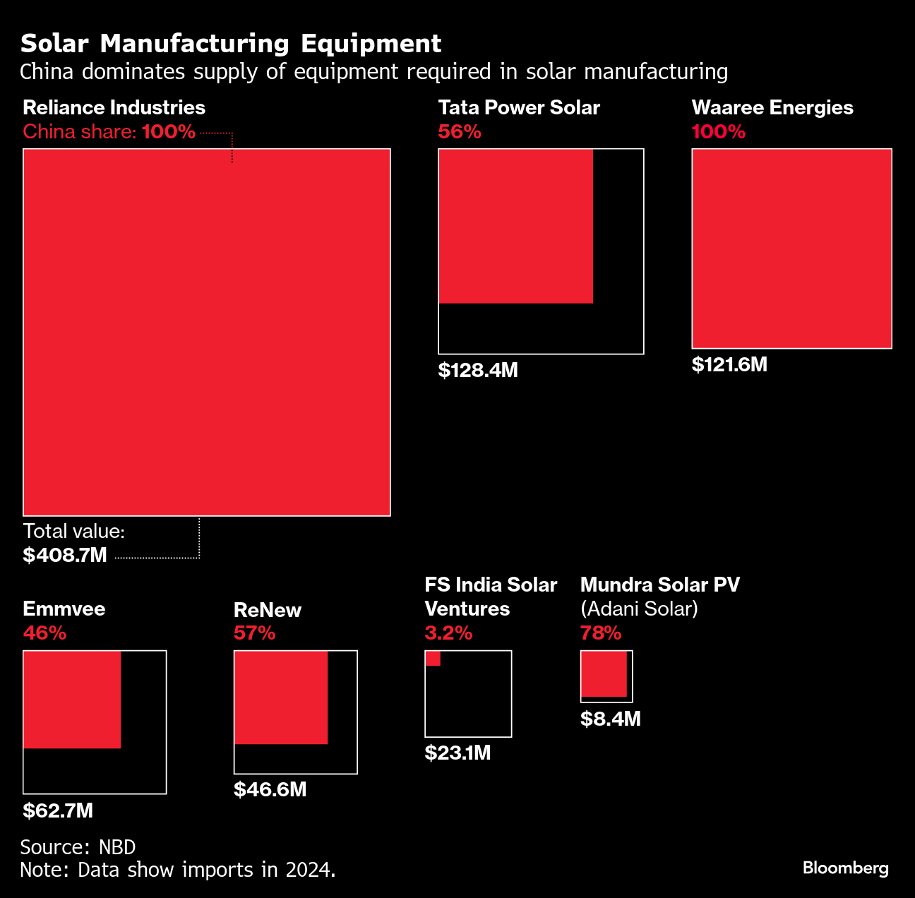 An additional barrier for solar firms outside China has been the No. 2 economy’s grip on supply of manufacturing equipment, and particularly the appliances used at vital stages of the production process. That’s creating further risks for Indian producers, with China already showing a willingness to restrict the flows of some specialized appliances or expertise in competitive sectors.