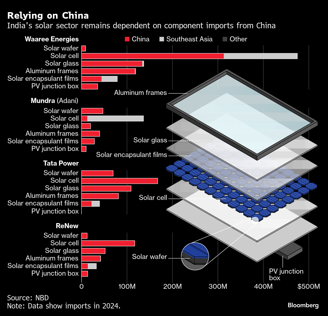 For solar glass and aluminum frames, four of India’s main panel producers were each more than 97% dependent on Chinese imports in 2024, while only 2 of 7 leading firms sourced more than half of their manufacturing equipment outside China.