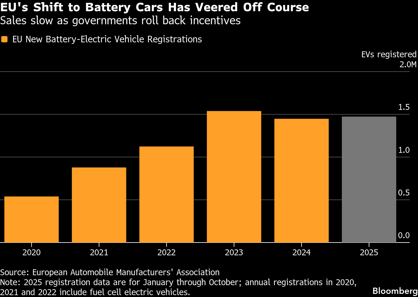 The potential changes come after sales growth of new battery cars slowed as countries like Germany, the bloc’s biggest market, removed buying incentives. While growth has resumed — partially in response to the reintroduction of perks — the trajectory for EV sales remains far below what’s needed to meet the EU’s mandate. Uptake across the region remains highly uneven.