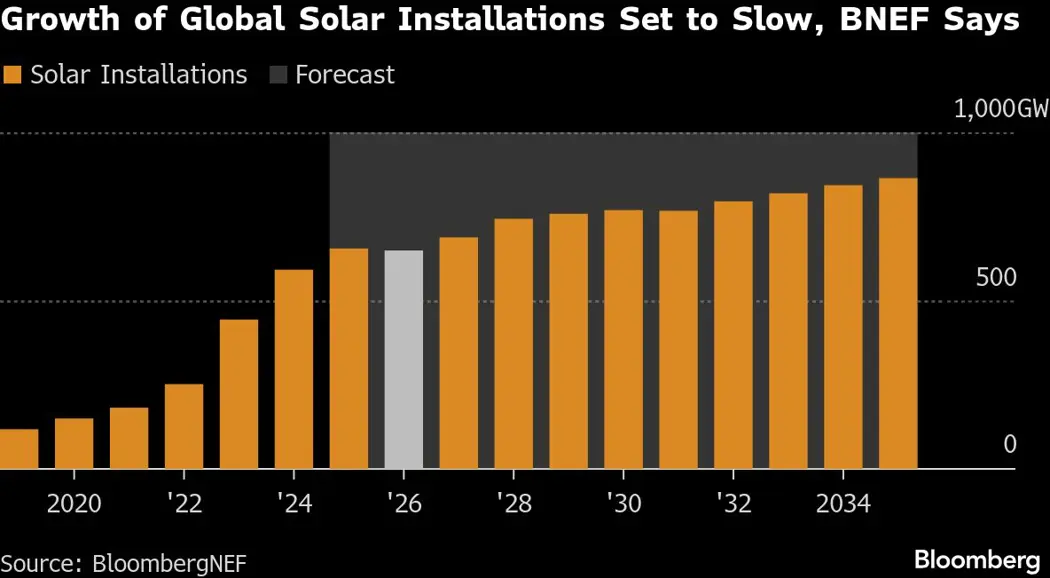 The world is set to add 649 gigawatts of solar power capacity in 2026, down slightly from 2025, BNEF’s Global PV Market Outlook showed. This year’s growth is the weakest in seven years, and next year’s contraction will be the first in records going back to 2000.