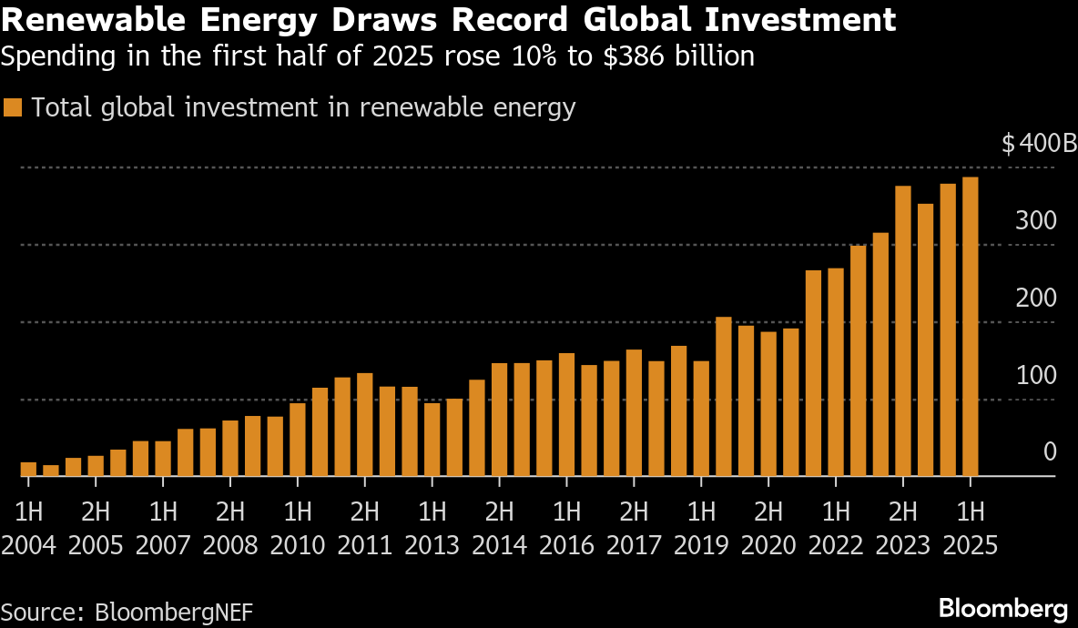 The optimism is reflected in rising investment. Renewable energy projects attracted a record $386 billion during the first six months of 2025, up 10% from the same time last year, according to a report by BloombergNEF. While US investment fell 36% compared with the second half of 2024, that in the European Union surged over 60%, driven by onshore and offshore wind.