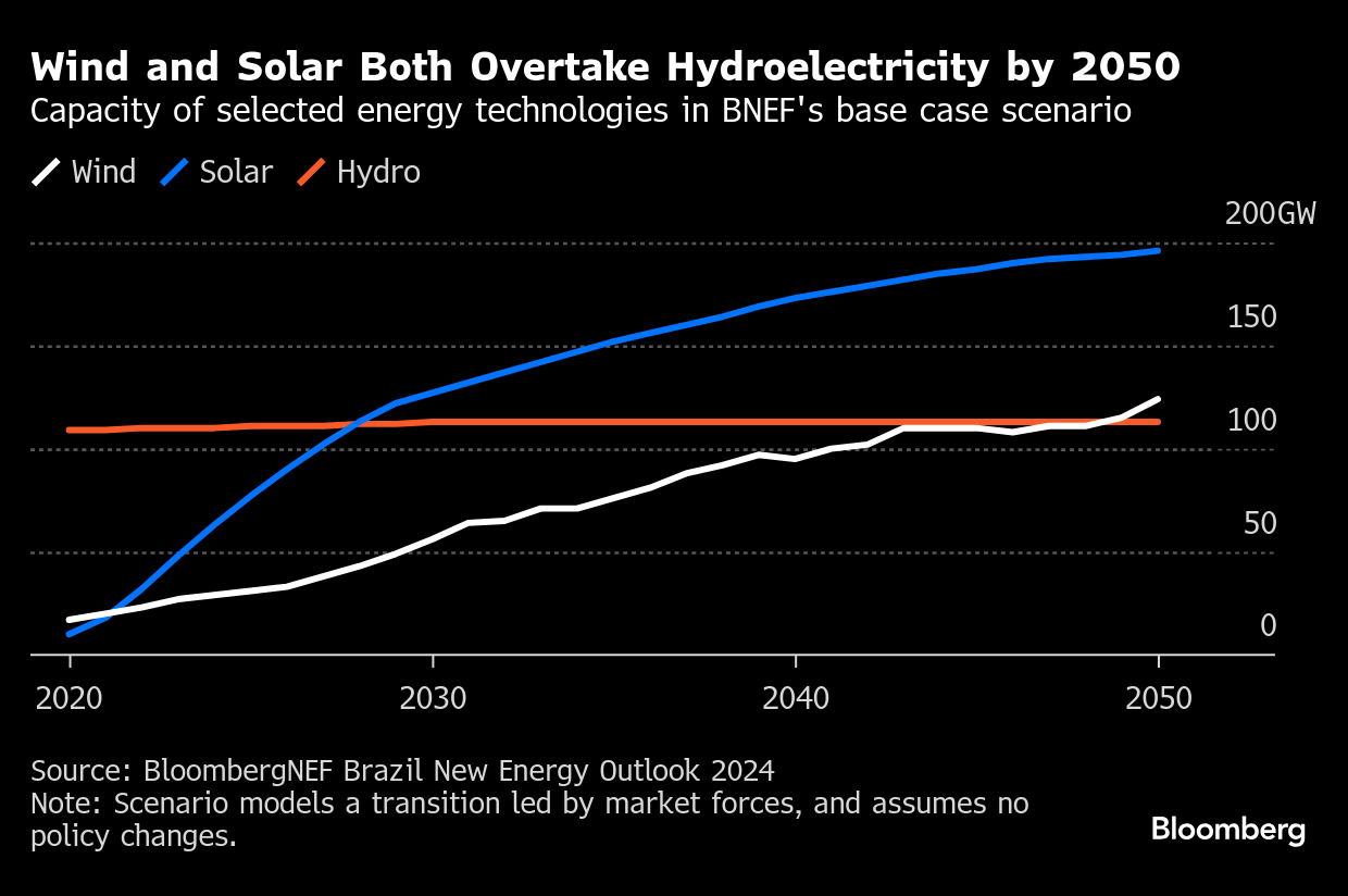 Around 90% of Brazil’s electricity generation in 2024 came from renewables. That sector is set to grow, largely because it’s cheap to expand wind and solar. Both are expected to overtake the supply from hydroelectricity by 2050.