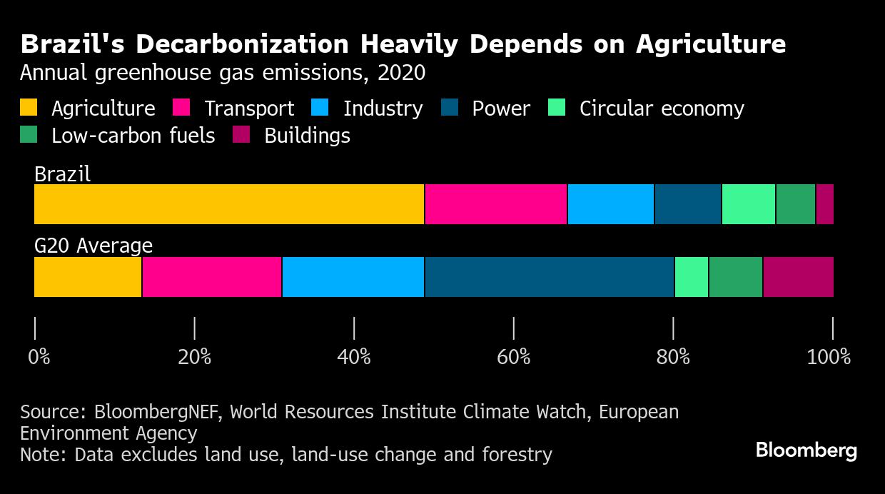 To meet its climate ambitions, Brazil will need to show it’s tackling deforestation and agriculture emissions, along with addressing energy transition issues, according to BNEF. Still, the analysis of Brazil’s power, transportation, industry and buildings sectors does not see a scenario where the country aligns with 1.5C.