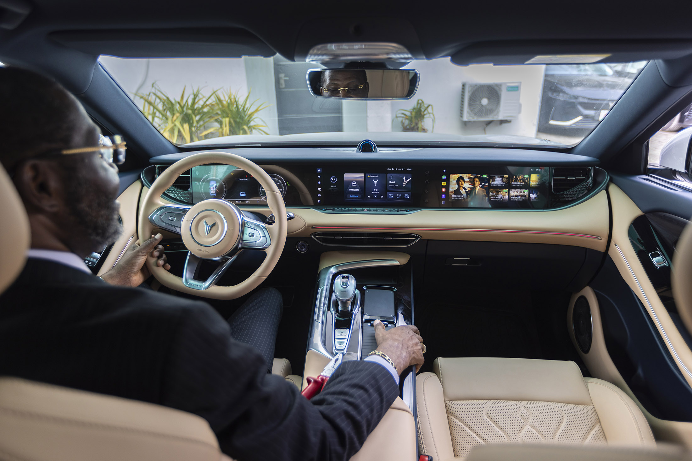 Faleye inside a luxury Saglev EV at their sales center.Photographer: Andrew Esiebo/Bloomberg