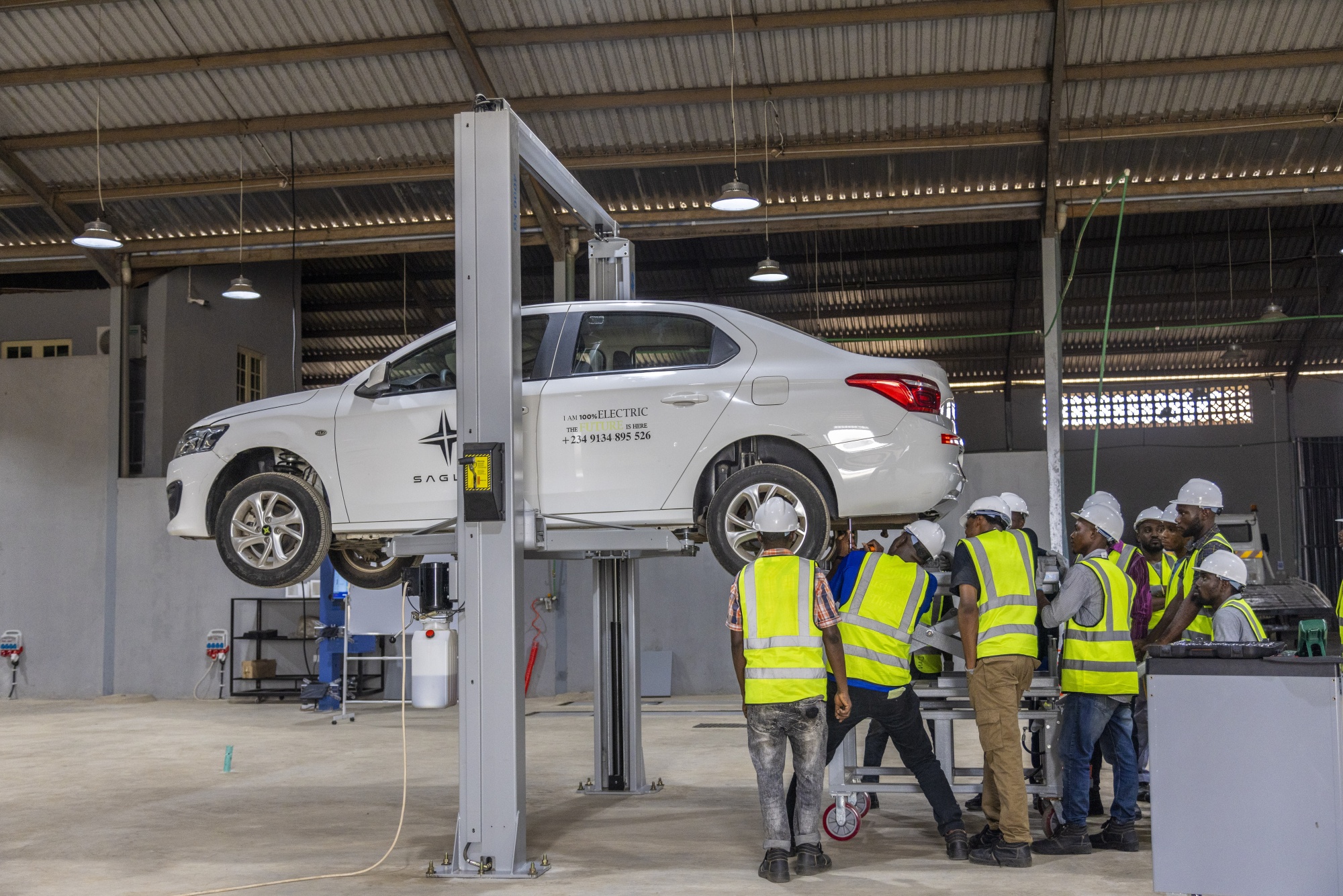 Staff examining an EV-Sedan at Saglev's EV assembly plant on the outskirts of Lagos.Photographer: Andrew Esiebo/Bloomberg