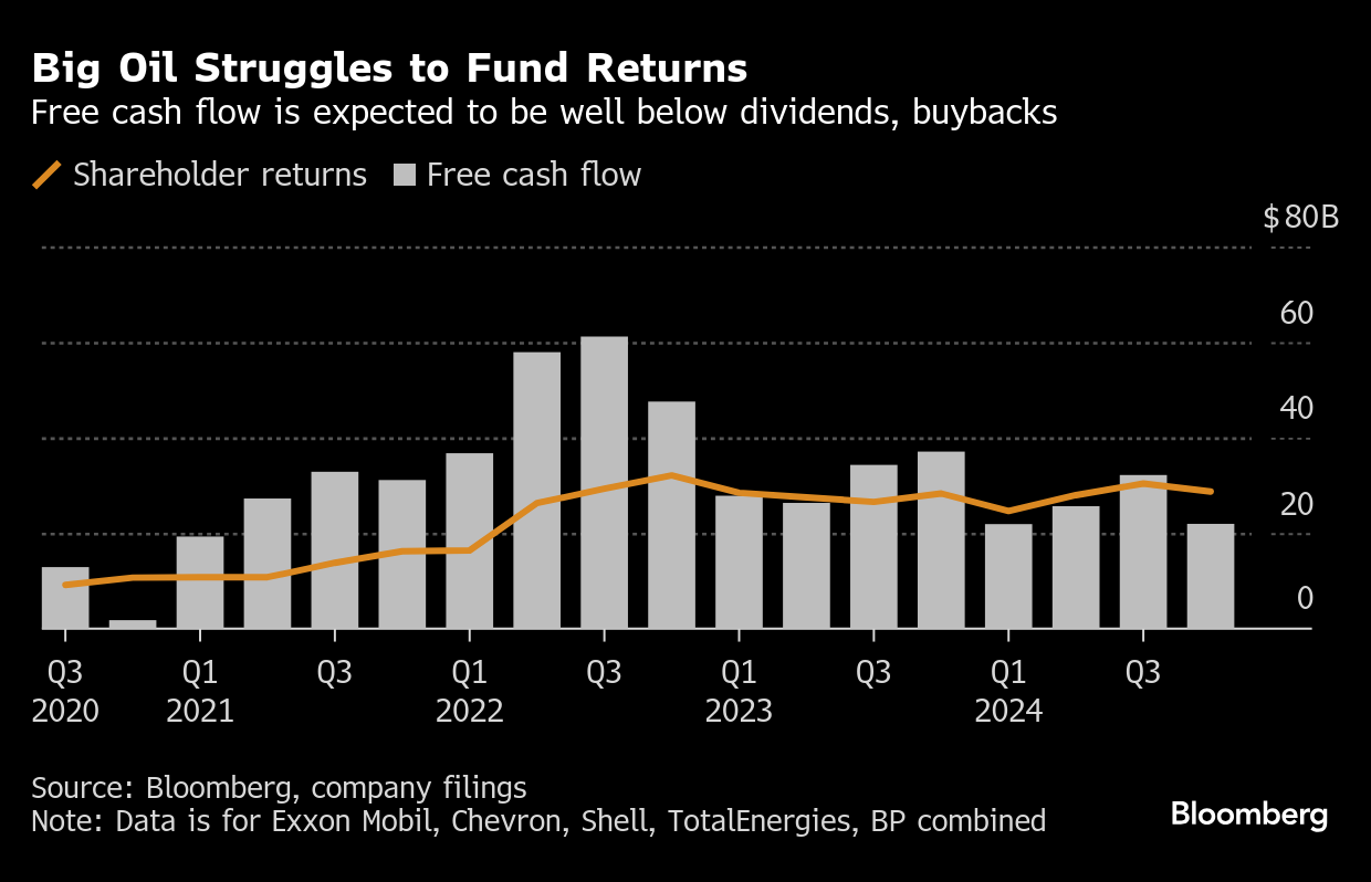 The international Brent crude benchmark averaged roughly $74 a barrel during the fourth quarter, down 11% from a year earlier. The slide pressured the biggest oil companies’ capacity to fund shareholder-friendly outlays such as dividends.