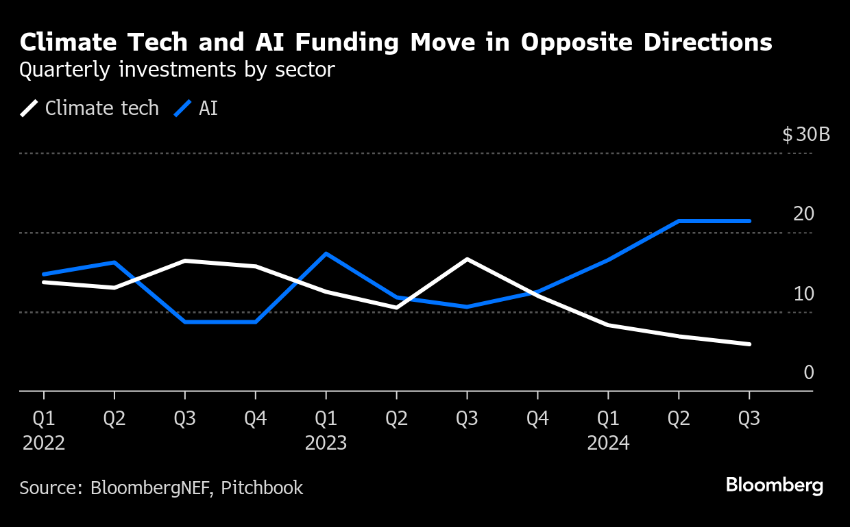 Climate-tech equity raising has also dipped dramatically to an estimated $43 billion in 2024 from more than $127 billion in 2022, according to BloombergNEF. Still, market intelligence firm Sightline Climate estimates investors have roughly $86 billion in unspent cash, giving them the latitude to make big bets if they want.