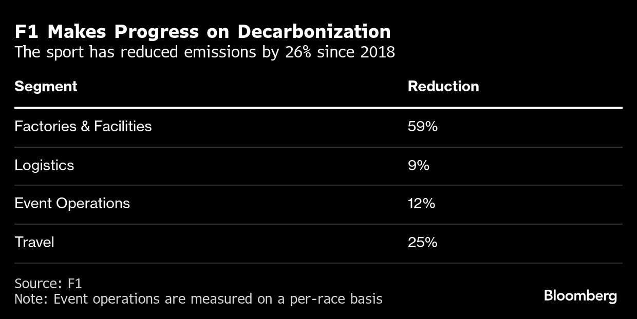The sport has achieved carbon reductions across the four major categories that it tracks: factories and facilities, down 59% since 2018; logistics, down 9%; event operations, down 12% on a per-race basis; and travel, down 25%.