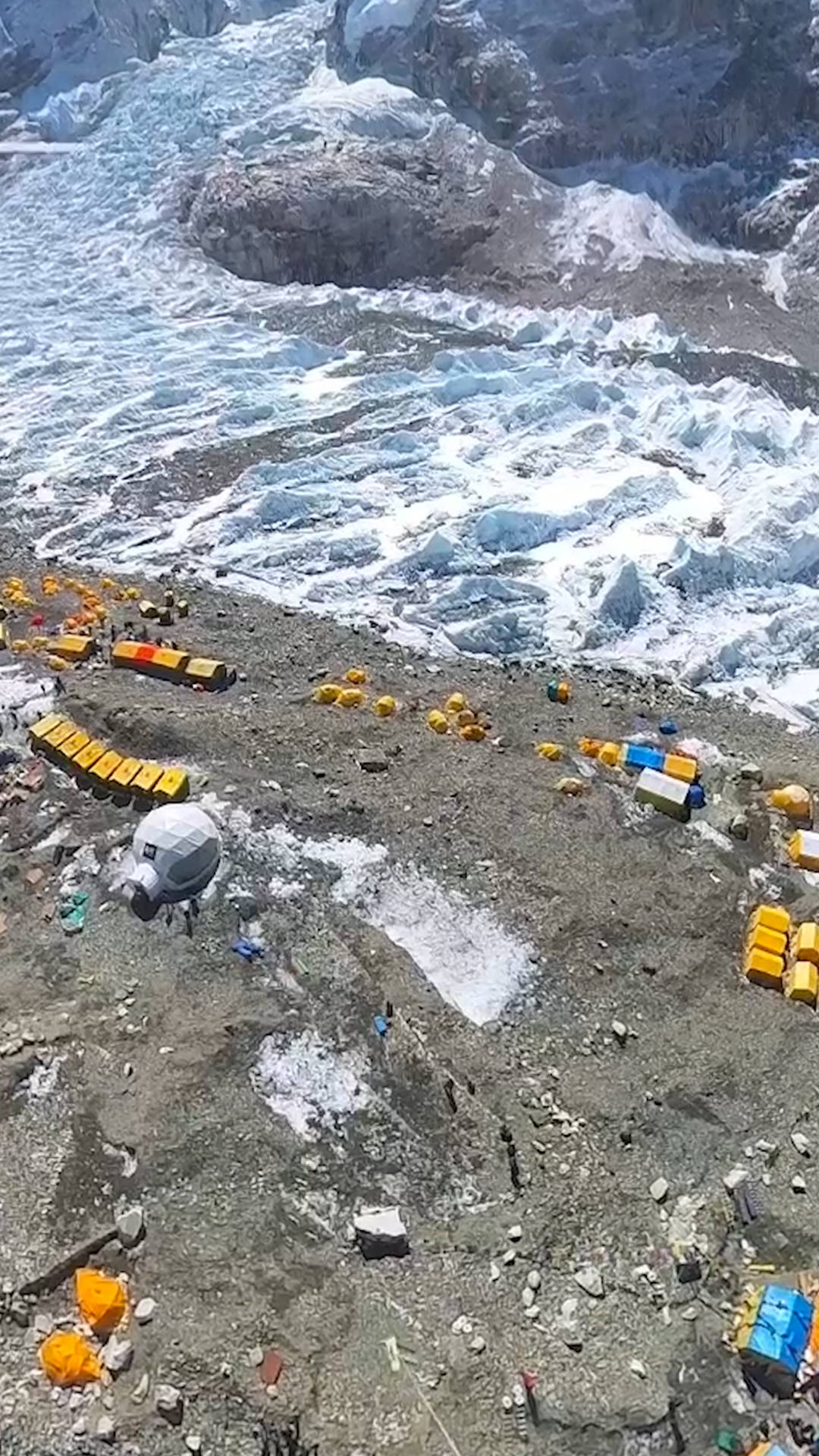 Drones have been deployed to haul garbage from Everest’s Camp 1, which sits at 6,065 meters (19,898 feet) above sea level down to base camp, about 700 meters below. After a DJI FlyCart 30 delivers supplies like ropes and ladders up the peak, Sherpas hook on a debris-filled garbage bag for the drone’s return journey as it buzzes down the mountain, sounding like an oversized mosquito.