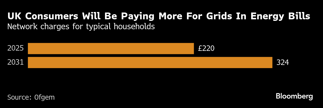 Ofgem said an upgraded network would allow for more renewables and less gas, trimming wholesale energy costs by around £25. Still, the increased spending will trickle down to consumers with network charges on bills estimated to rise by £104 by 2031.