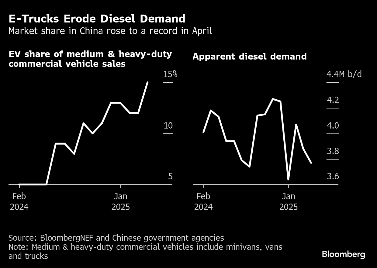 (Bloomberg) -- More and more Chinese trucks are being powered by batteries, another sign that oil-based fuels are getting shoved to the sidelines in an increasingly electrified economy.