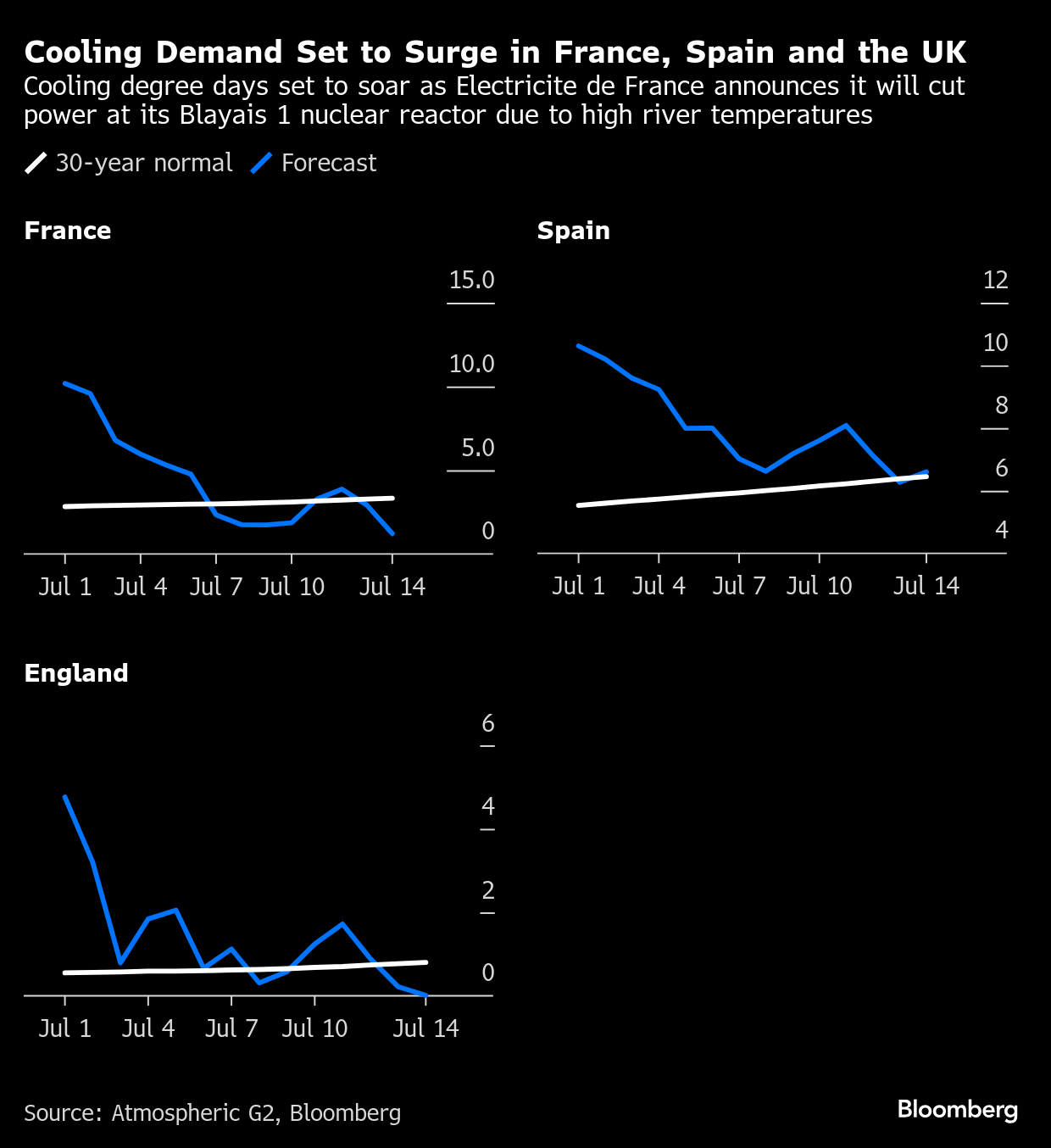 Power prices across Europe are surging as the heat drives up cooling demand, while forcing some nuclear reactors to curb generation. French day-ahead prices climbed to a three-month high in recent days, while UK day-ahead prices hit the highest since March.