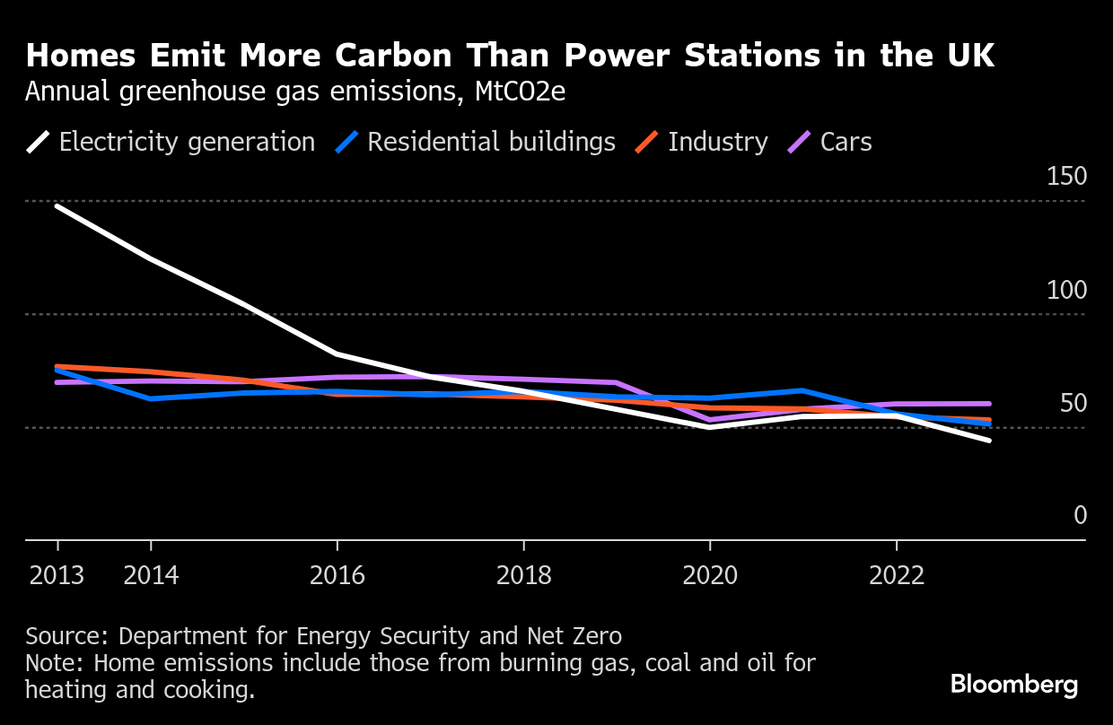 (Bloomberg) -- If you live in the UK, your dishwasher and fridge’s carbon footprint has shrunk by a lot, largely because the government and companies have spent billions of pounds to install wind and solar power. Over the past 35 years, that switch has helped cut emissions from electricity generation by 80%.