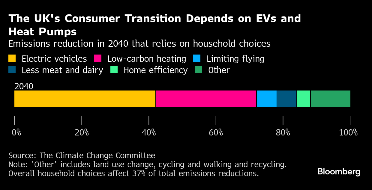 The advisers also plotted how British households get there. Switching to EVs and heat pumps accounts for more than two-thirds of the needed cuts, while driving less and eating less meat and dairy make up the balance.