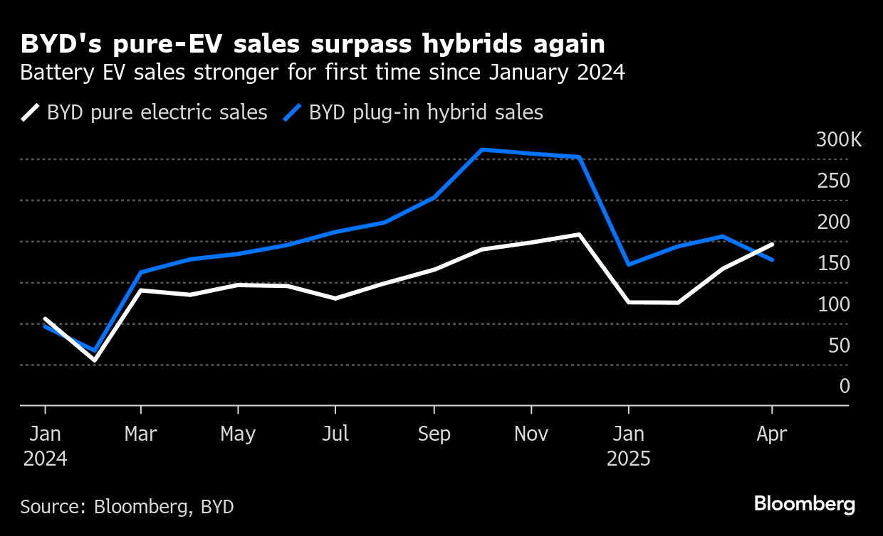 Notably, BYD’s battery passenger electric vehicle sales of 195,740 last month topped its plug-in hybrid sales of 176,875, the first time pure EV sales have been in front since early 2024.