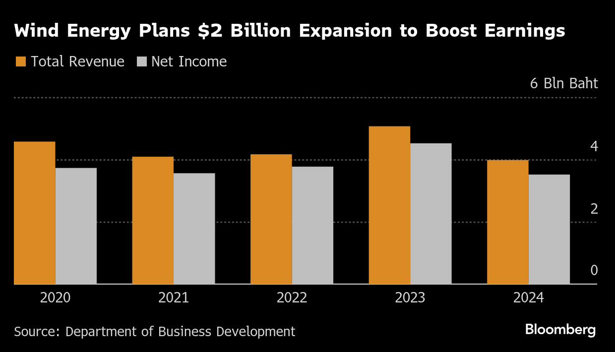 The closely held company will fund its growth with an initial public offering on the Thai exchange, although that’s currently in limbo while it resolves a legal issue, according to Nuttpasint. Wind Energy’s net income and revenue both fell by more than a fifth in 2024.