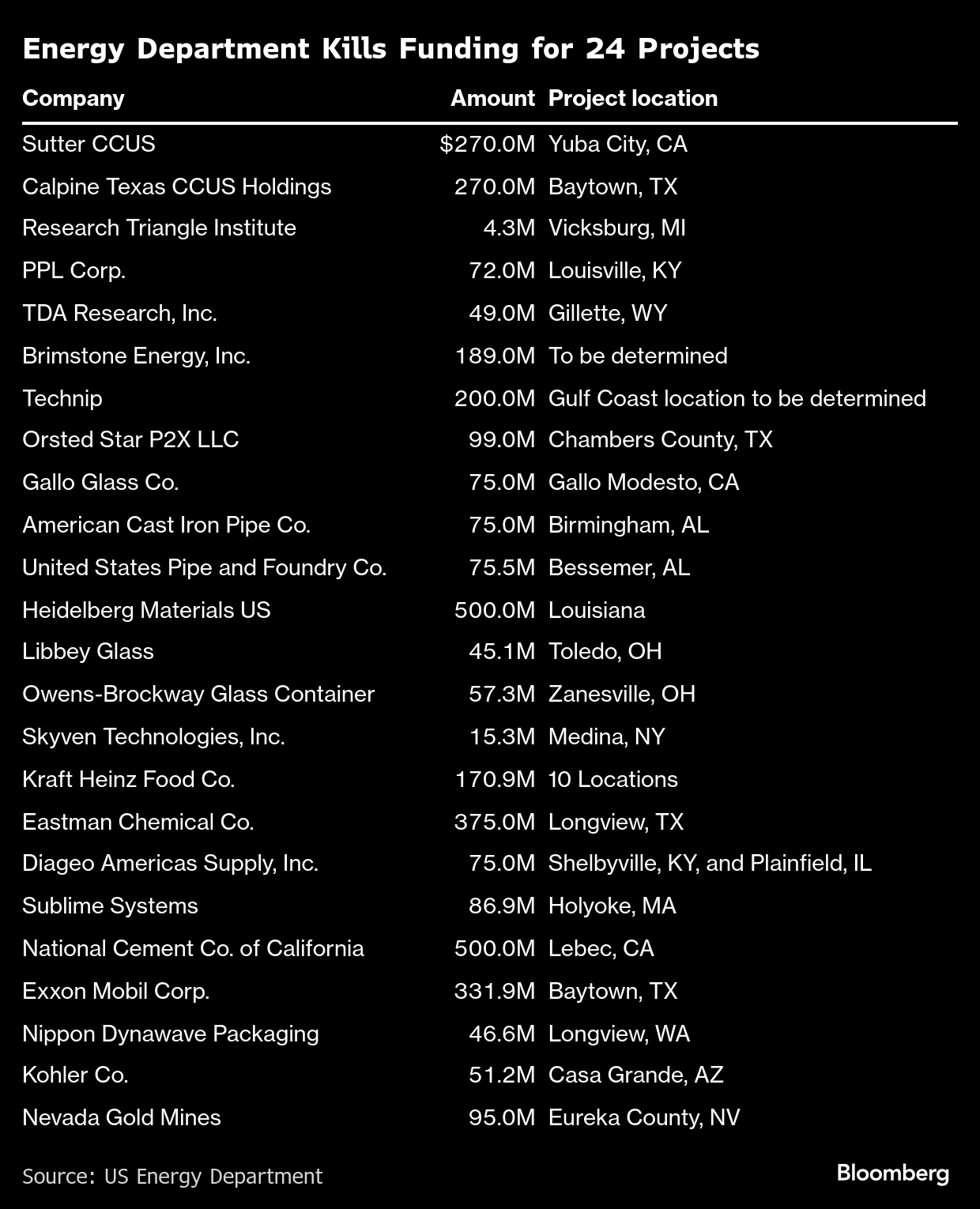 Among the canceled awards was $331 million to Exxon Mobil Corp. for a project to use hydrogen instead of natural gas at the company’s Baytown, Texas, Olefins Plant; $170 million to Kraft Heinz Co. for a series of clean energy projects; and $500 million to Heidelberg Materials AG for a low-carbon cement project, according to a list provided by the Energy Department.