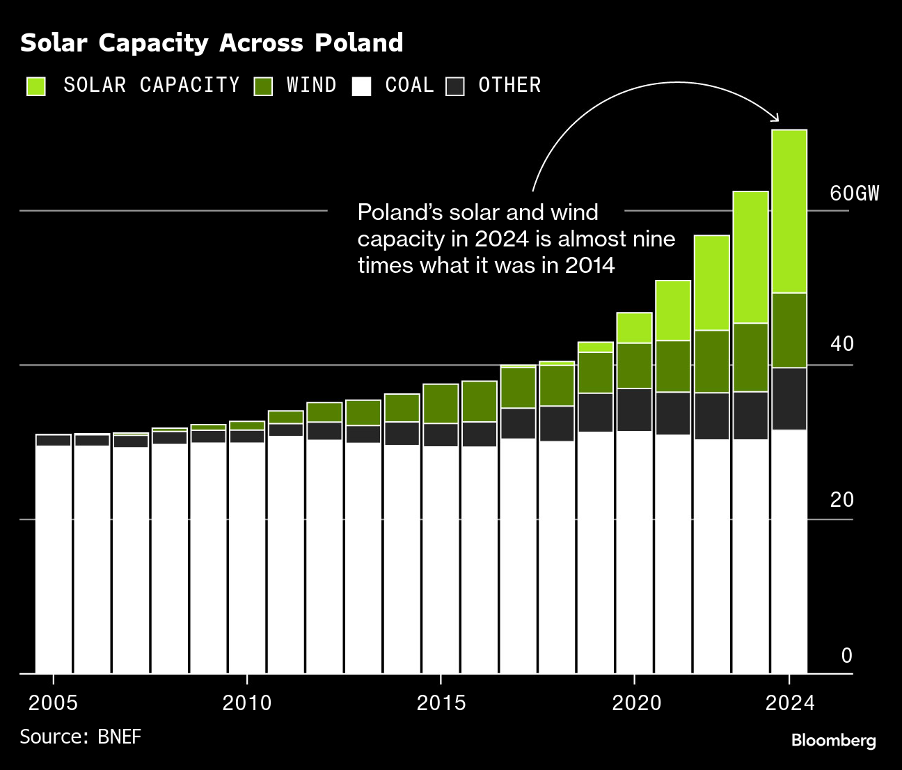 In Poland, solar and wind capacity have soared almost nine-fold in the past decade and renewables made up over 40% of the country’s power in 2024, according to BloombergNEF. The country is on track to triple its clean energy capacity by the end of this decade from 2023 levels, meeting a global target set by nations at the United Nations climate summit known as COP two years ago.