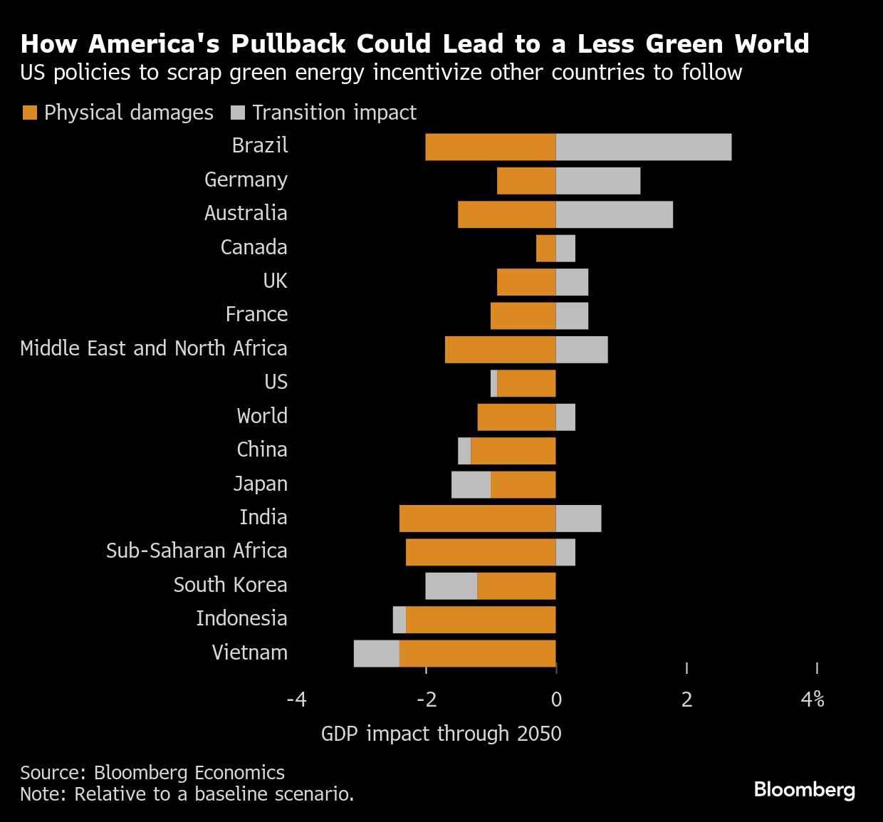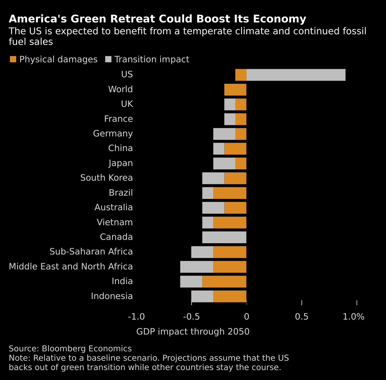 (Bloomberg) -- Slashing green energy goals and doubling down on fossil fuels, the kinds of policies President Donald Trump has been pushing, would benefit the US economy in the long run — and hurt countries still betting on the green transition.