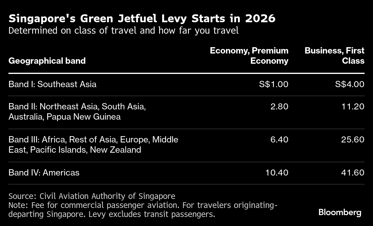 (Bloomberg) -- Air passengers departing Singapore will pay a green fuel levy of as much as S$41.60 ($31.95) from next year as the city-state locks in a key step in its effort to cut the aviation industry’s emissions.