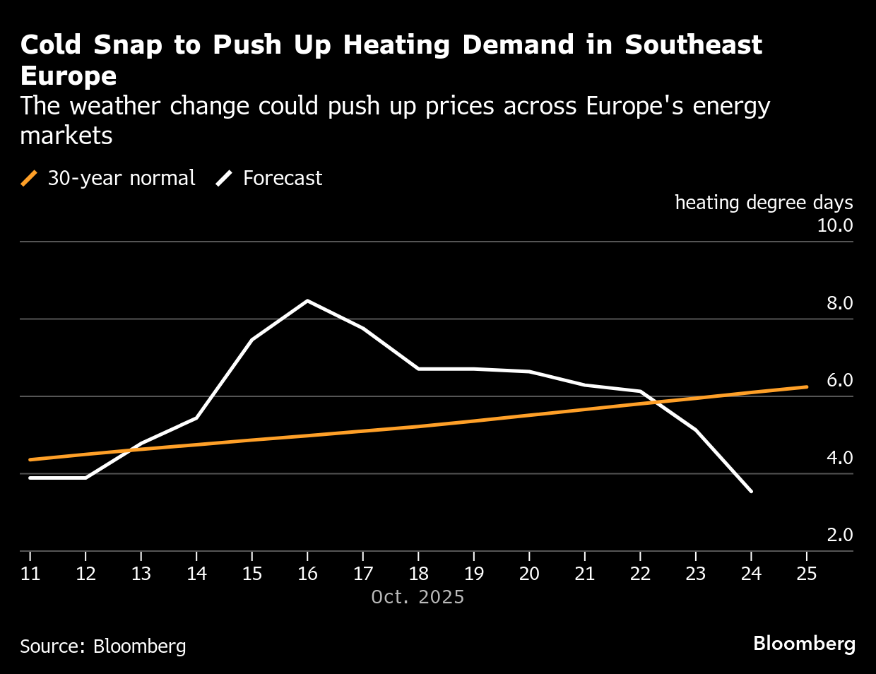 Next week, temperatures in central and southeastern Europe could briefly drop several degrees below normal, raising heating demand in France, Germany, Italy and much of eastern and southeastern Europe, data from Atmospheric G2 and Bloomberg models show.