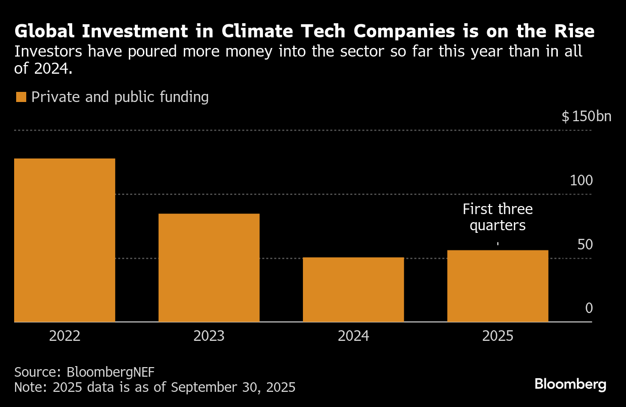 Private and public investors worldwide channeled as much as $56 billion into green businesses ranging from clean energy to storage and electric vehicles during the nine months ending in September, according to a new BloombergNEF report. By contrast, the climate tech industry snagged less than $51 billion in 2024.