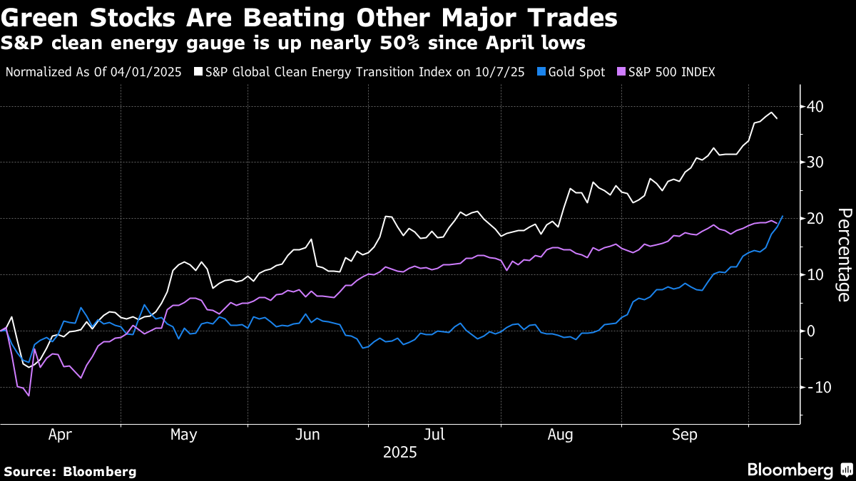 The S&P Global Clean Energy Transition Index has surged close to 50% since US President Donald Trump’s April tariff announcements caused havoc across markets. That compares with the roughly 35% gain delivered by both the S&P 500 Index and gold over the same period.