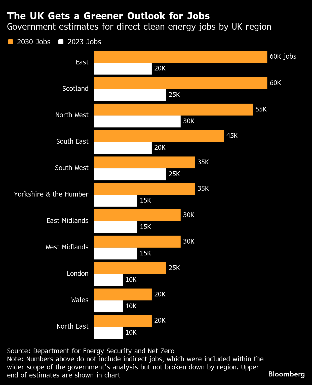 (Bloomberg) -- The UK’s push to decarbonize its energy system by the end of the decade will give the biggest employment boost to the East of England and Scotland.