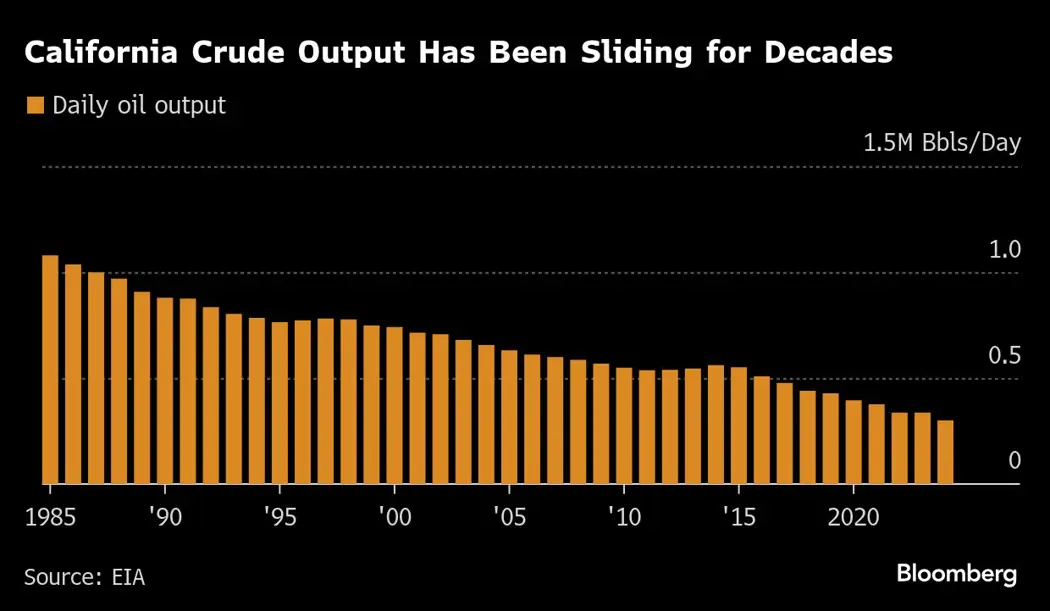 California crude output has fallen by more than 70% in the past four decades as fields first tapped in the early 20th century began to run dry, competition increased from lower-cost sources, and some of the nation’s strictest environmental rules piled on costs. Newsom is seeking to make it easier for inland drillers to obtain permits and boost oil output, while further restricting offshore crude production.