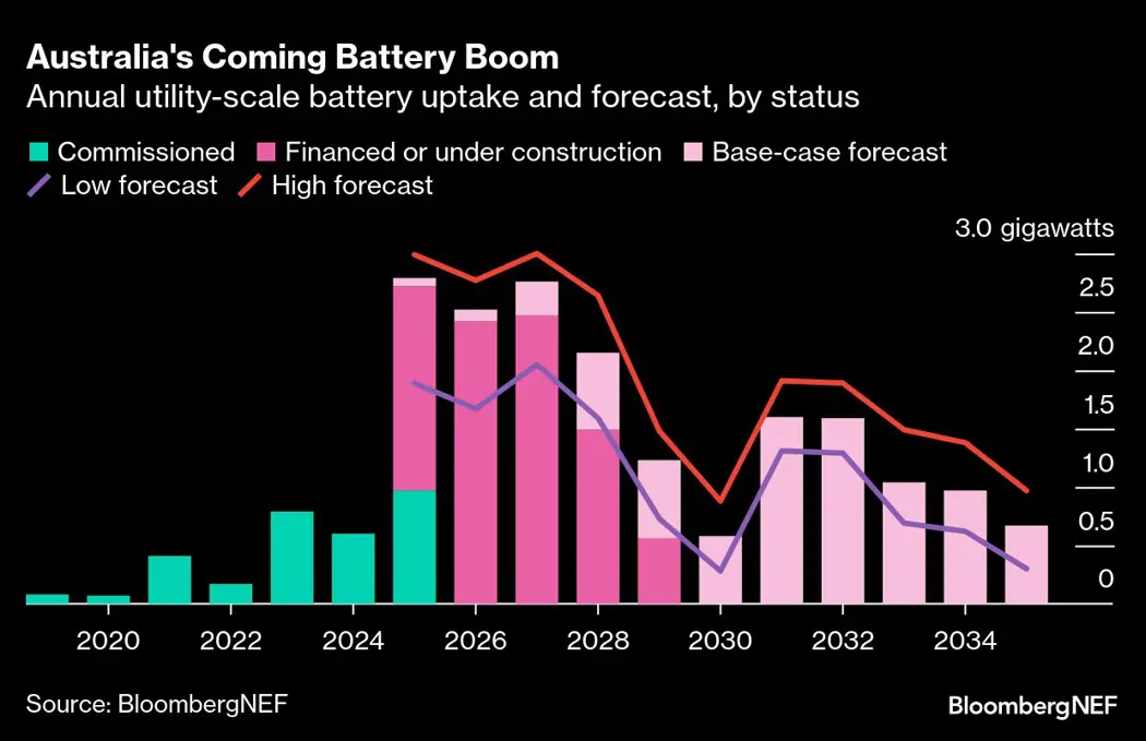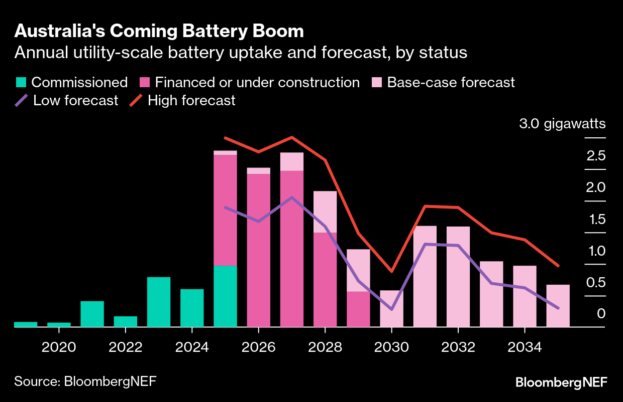 Australia was slower to adopt energy storage than early movers such as China, the US and Germany, but has since vaulted into the top five utility‑scale battery markets, according to Rystad Energy. The nation is set to install more than 20 gigawatts of large-scale batteries by 2035, a more than 500% jump from the 3.3 gigawatts in operation as of July, according to BNEF.
