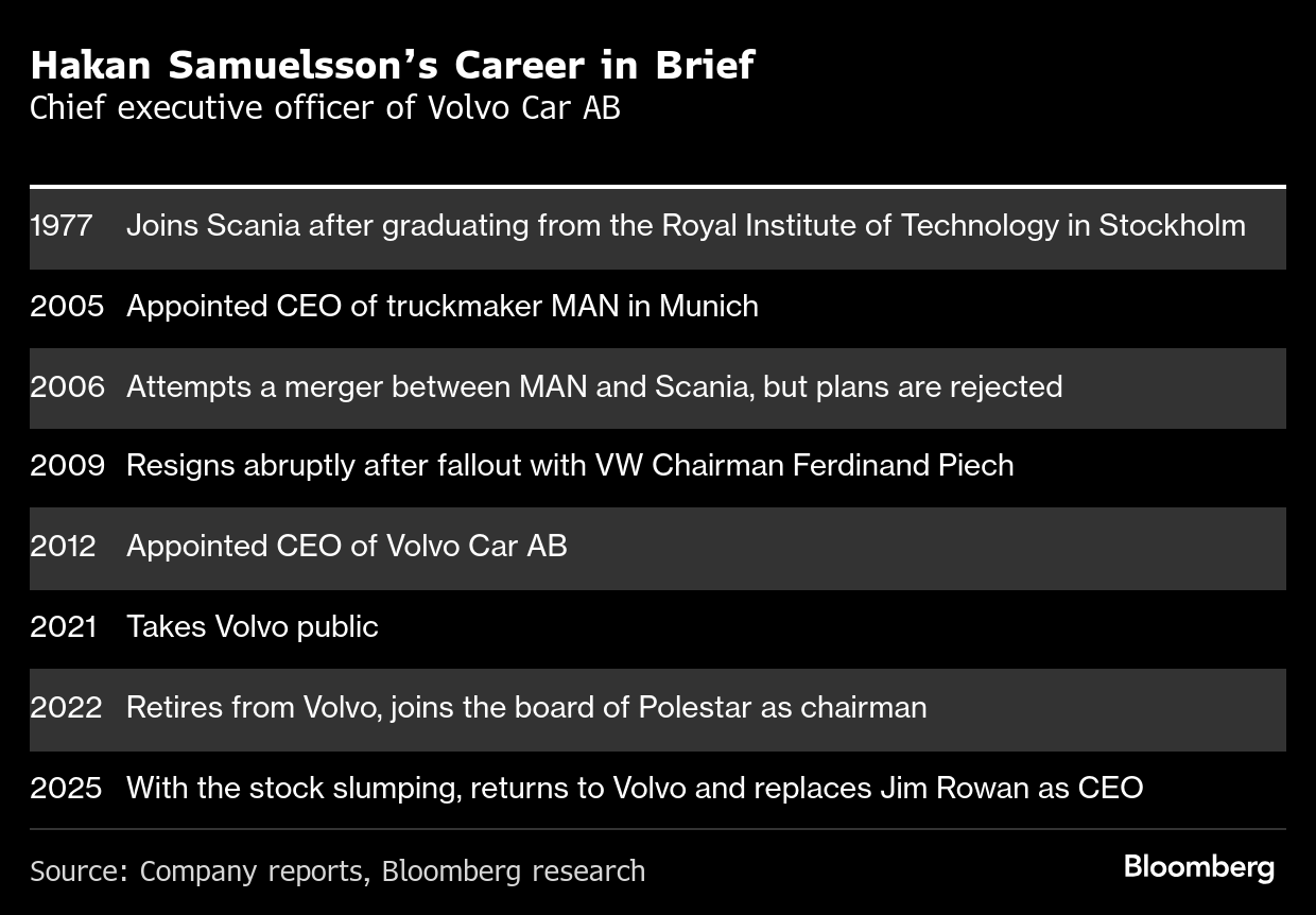 (Bloomberg) -- Hakan Samuelsson was brought out of retirement to guide Volvo Car AB through one of its most challenging periods.