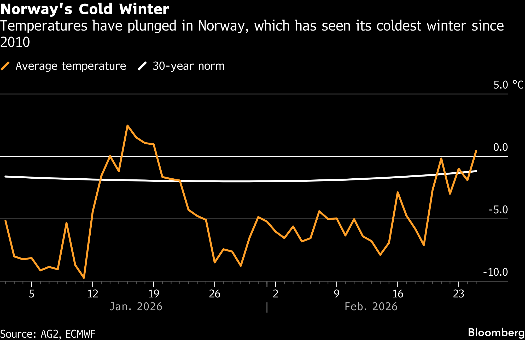 This year’s frigid winter has also boosted electricity demand. Oslo recorded more than 30 consecutive days with temperatures below 0C (32F), the longest such stretch in about 16 years, according to the Norwegian Meteorological Institute. Prolonged freezing conditions have raised heating demand and stored precipitation as snow and ice, delaying inflows to reservoirs.