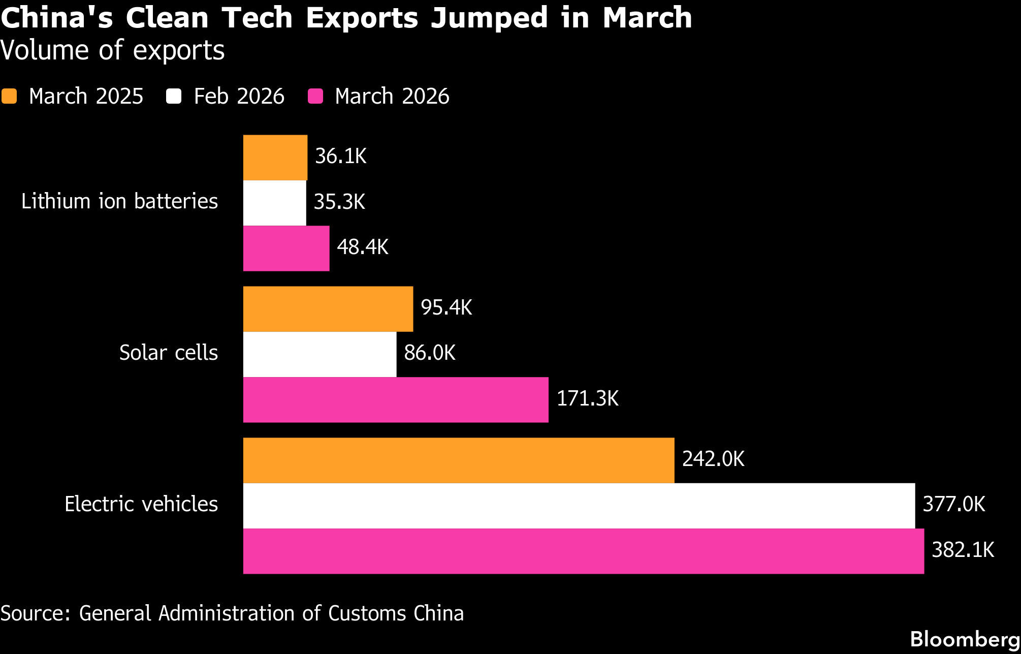 The most notable growth came in shipments of lithium-ion batteries and electric vehicles, with an annual increase of 34% and 53%, according to data released by China’s General Administration of Customs on Saturday. Solar cells also saw 80% growth last month. All three exports rose from February levels as well.