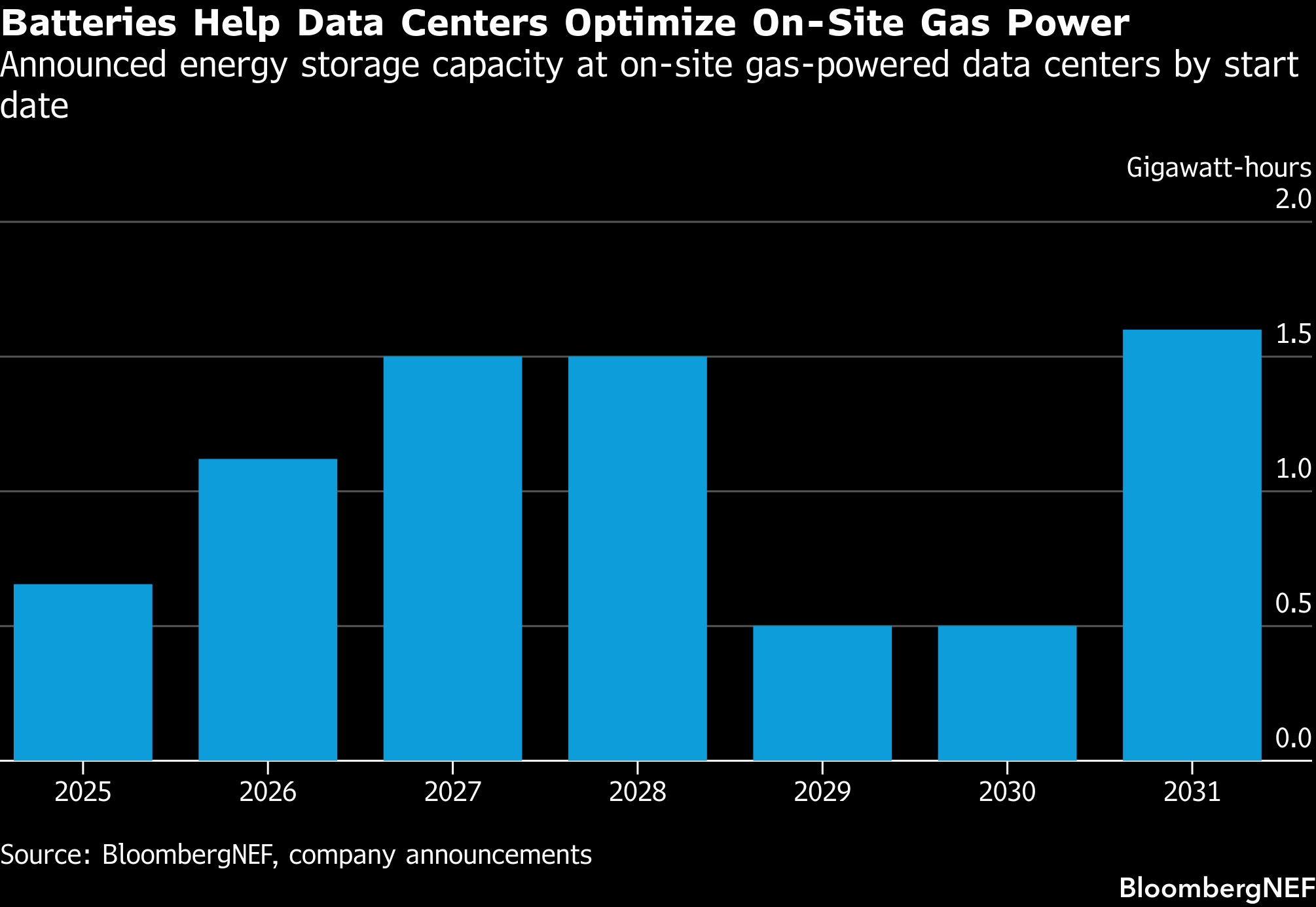 BloombergNEF has tracked 4.9 gigawatts of energy storage announcements that are co-located with on-site fossil fuel generation at data centers. That’s about 32% of announced global on-site data center battery capacity. The sites include some of the largest AI data center complexes under development, such as Elon Musk’s Colossus supercomputer in Memphis, Tennessee, and the combo has become so popular that companies such as Caterpillar Inc. and GE Vernova Inc. have announced products or partnerships pairing energy storage with gas generation.