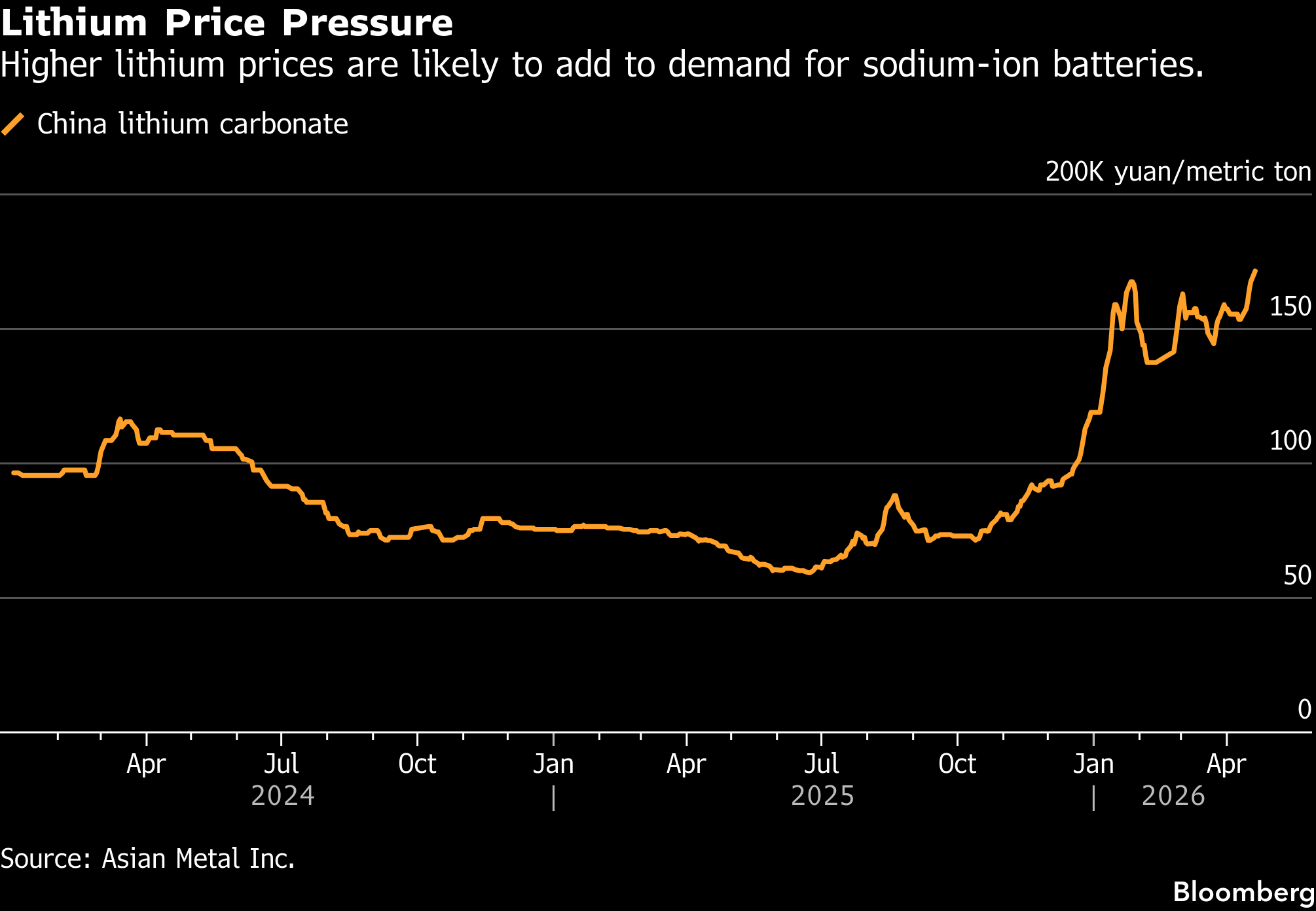 Equally important is the technology’s role as a potential shield from volatility in lithium prices. While still far below a peak touched in late 2022, prices of lithium carbonate in China surged almost 190% from a recent low last June to April 20, adding to pressure on battery costs from more expensive raw materials.